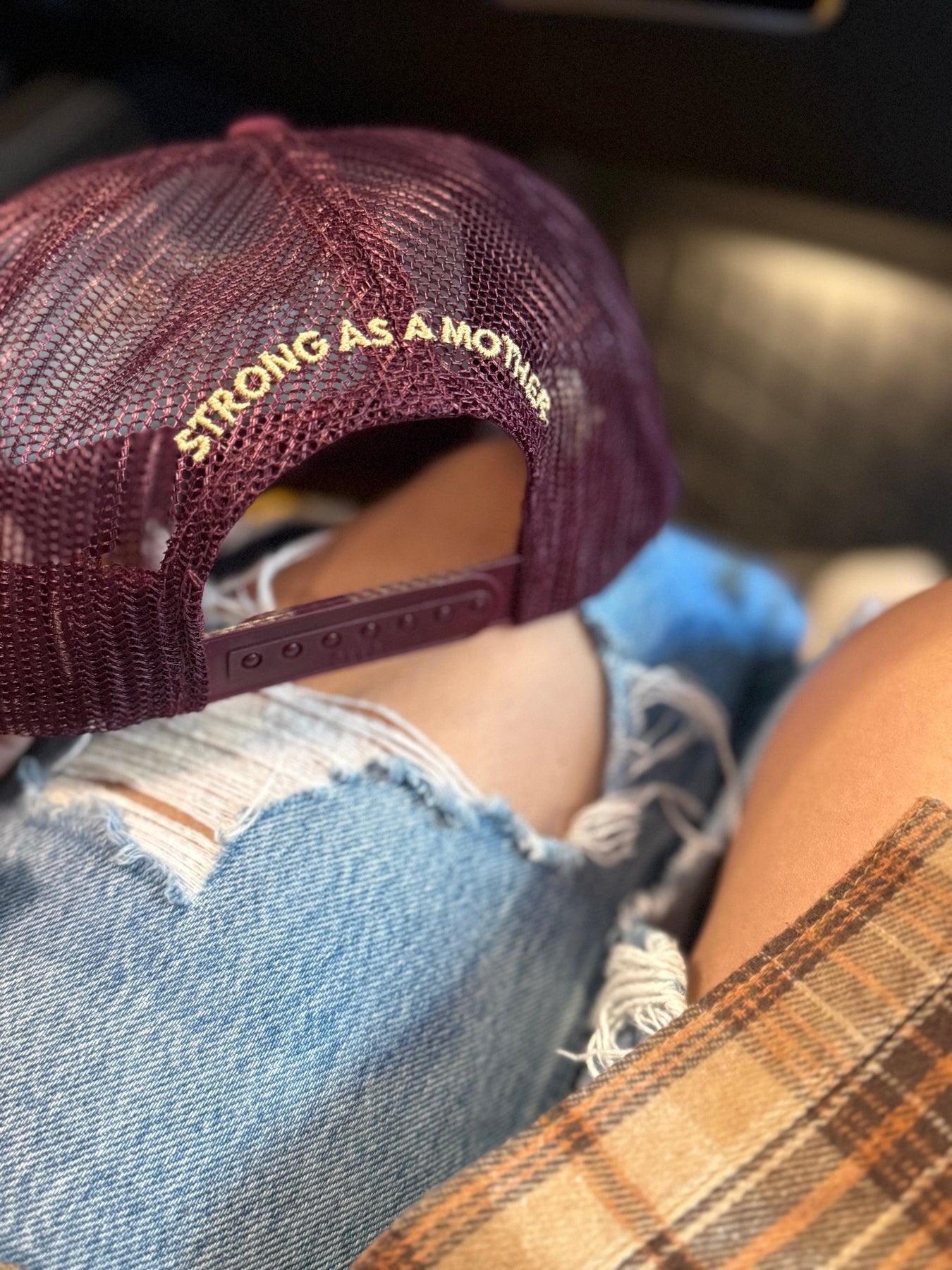 Logos are embroidered on the front and Strong as a mother® is embroidered on the back